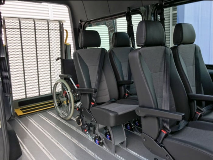 Der Mercedes-Benz Sprinter ist ein richtiges Allroundtalent. Mit den Umbauten von AMF-Bruns wird der Sprinter zu einem Kraftfahrzeug für mobilitätseingeschränkte Personen (KMP) und ist optimal für den Transport von Rollstuhlfahrern geeignet. Der Rollstuhl gelangt mit Hilfe eines AL1 Linearlifts über den Heckeinstieg in das Fahrzeug. Der Fahrgastraum lässt sich durch verschiedene Umbaumöglichkeiten individuell an die Anforderungen des Alltages anpassen.