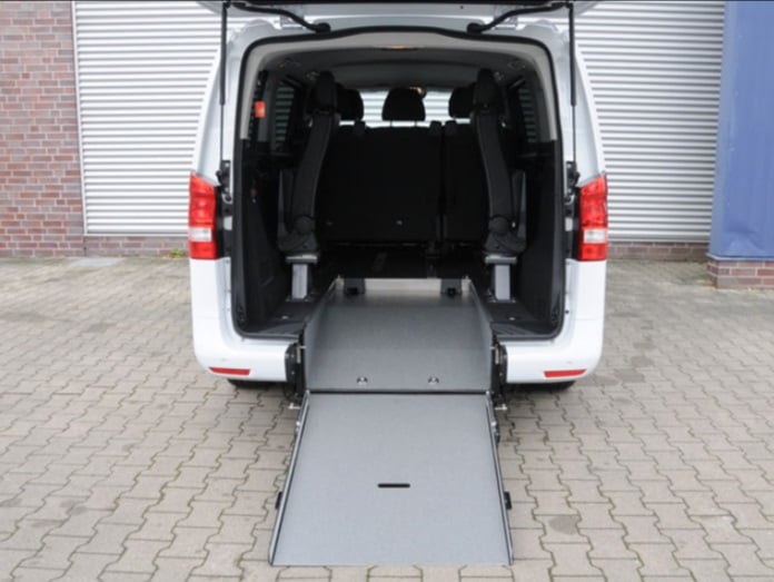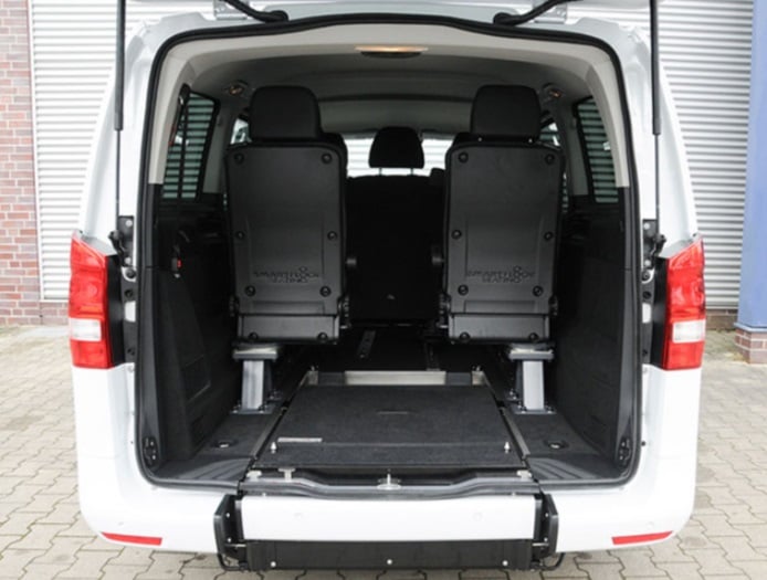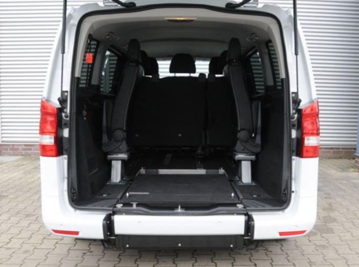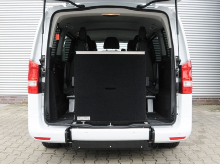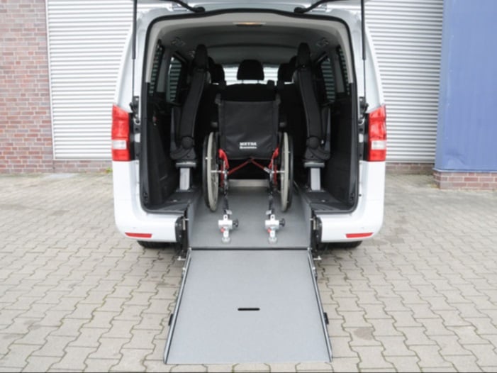 Die Mercedes-Benz V-Klasse ist ein rollstuhlgerechtes Fahrzeug für Passivfahrer. Durch den Heckausschnitt mit Auffahrrampe kann der Rollstuhlfahrer bequem befördert werden. Die rutschsichere Rampe ermöglicht einen einfachen Zugang zum Fahrzeug und dank der tiefergelegten Bodenwanne entsteht viel Platz im Fahrgastraum. Mit Hilfe eines Personen- & Rollstuhlrückhaltesystems wird der Rollstuhl am Fahrzeugboden befestigt und die Person gesichert. Zusätzlichen Schutz und Sicherheit bietet die Kopf- & Rückenstütze FutureSafe.