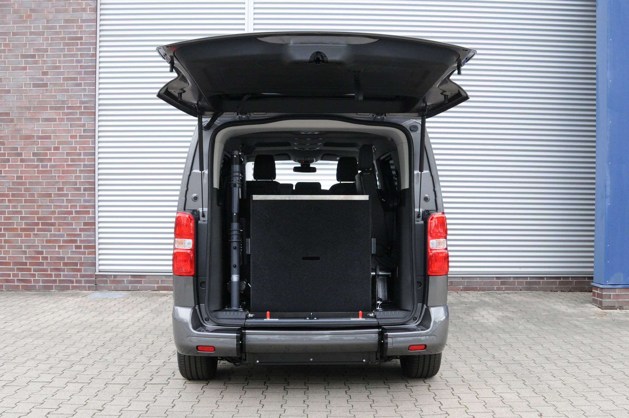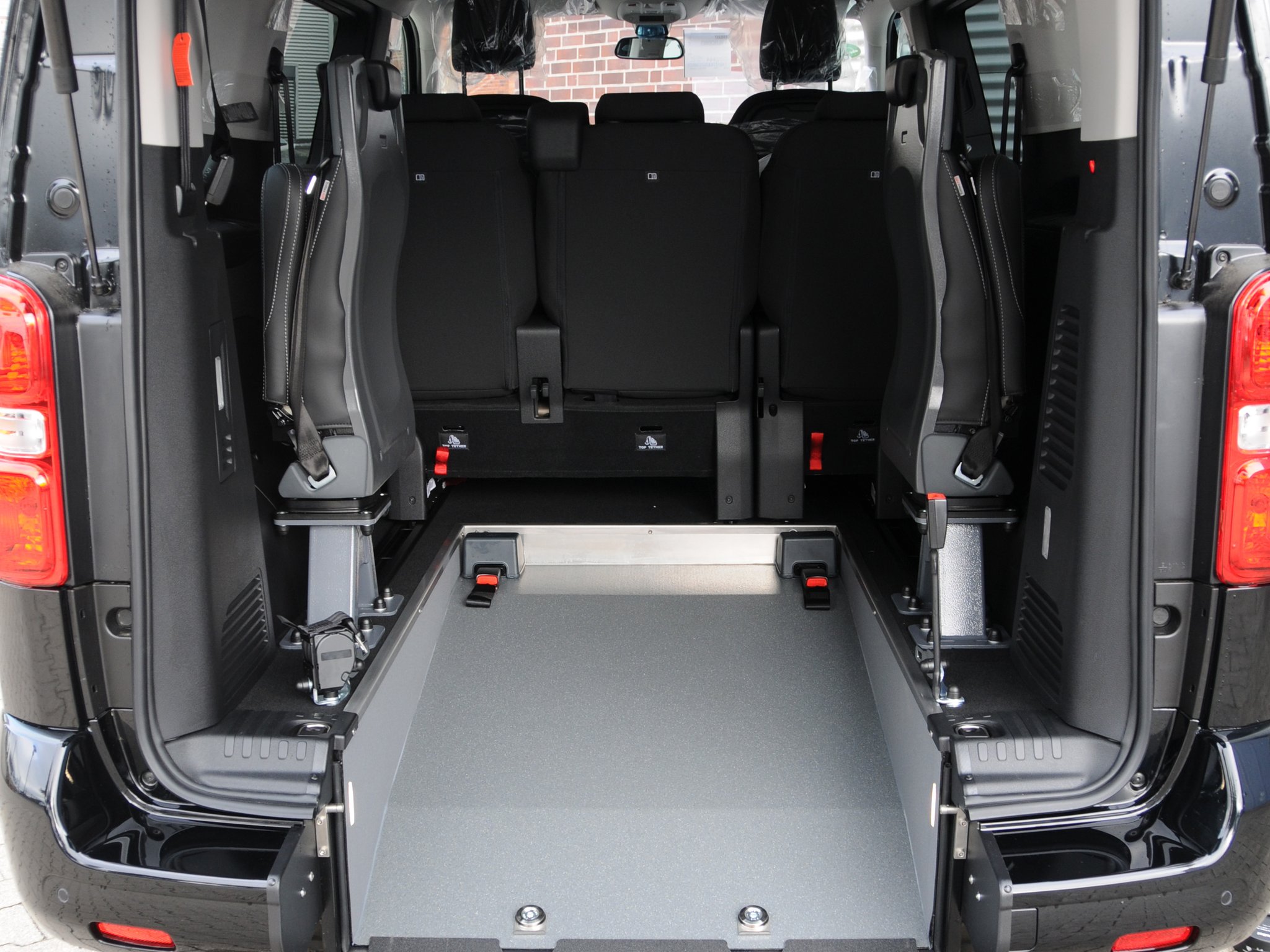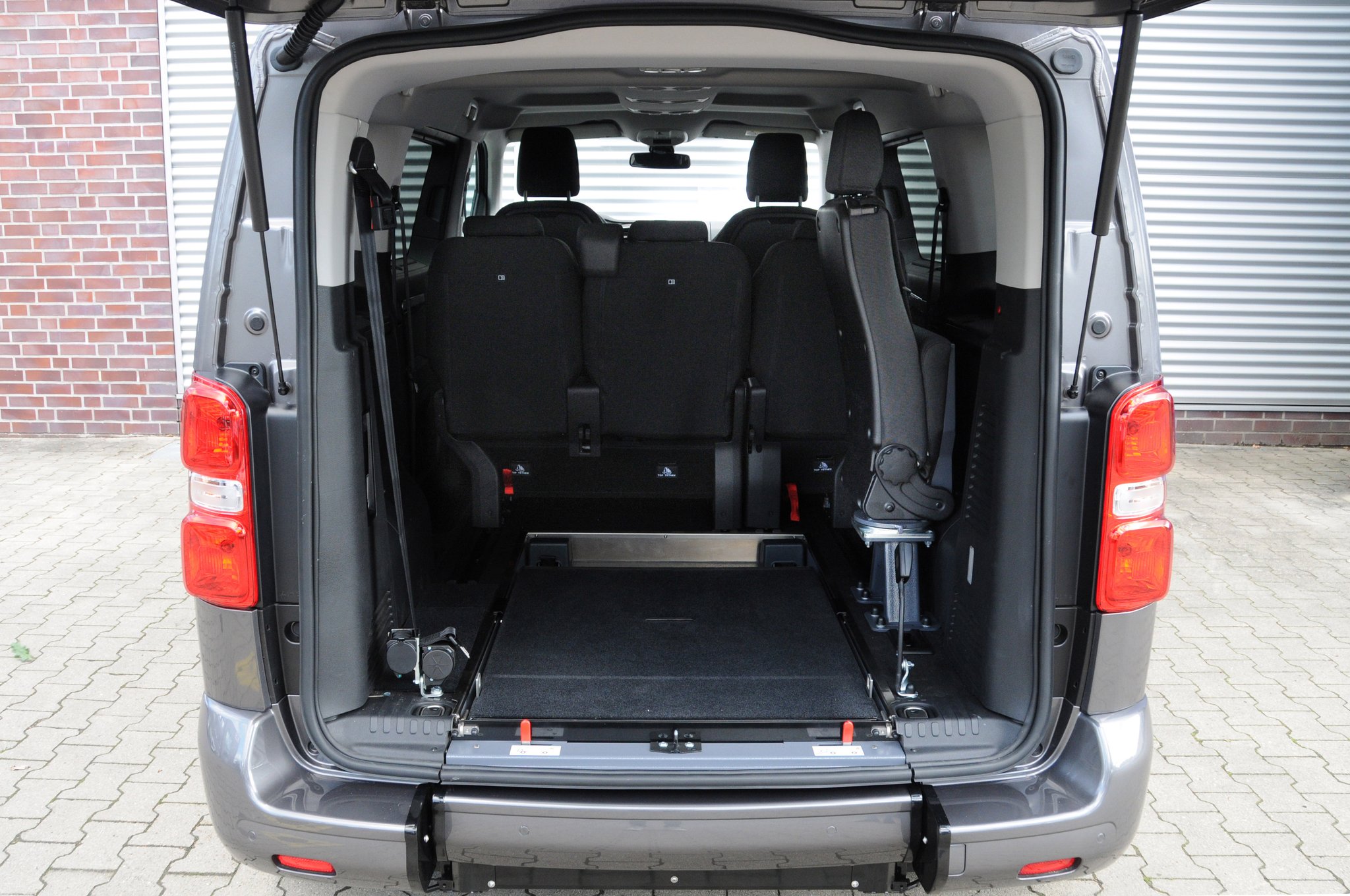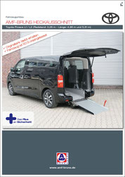 Der Toyota Proace ist ein rollstuhlgerechtes Fahrzeug für Passivfahrer. Durch den Heckausschnitt mit Auffahrrampe kann der Rollstuhlfahrer bequem befördert werden. Die rutschsichere Rampe ermöglicht einen einfachen Zugang zum Fahrzeug und dank der tiefergelegten Bodenwanne entsteht viel Platz im Fahrgastraum. Mit Hilfe eines Personen- & Rollstuhlrückhaltesystems wird der Rollstuhl am Fahrzeugboden befestigt und die Person gesichert. Extra Schutz bietet die Kopf- & Rückenstütze FutureSafe.