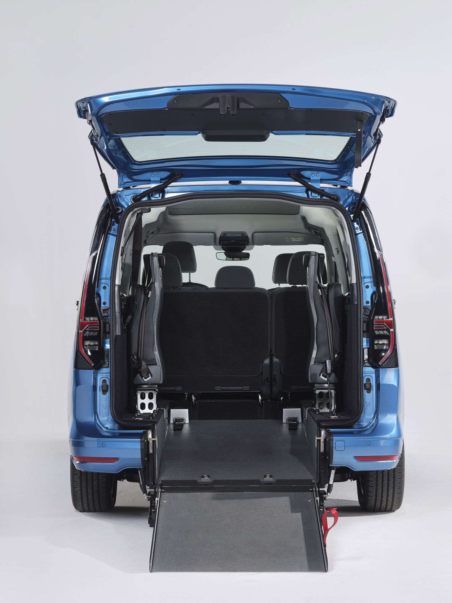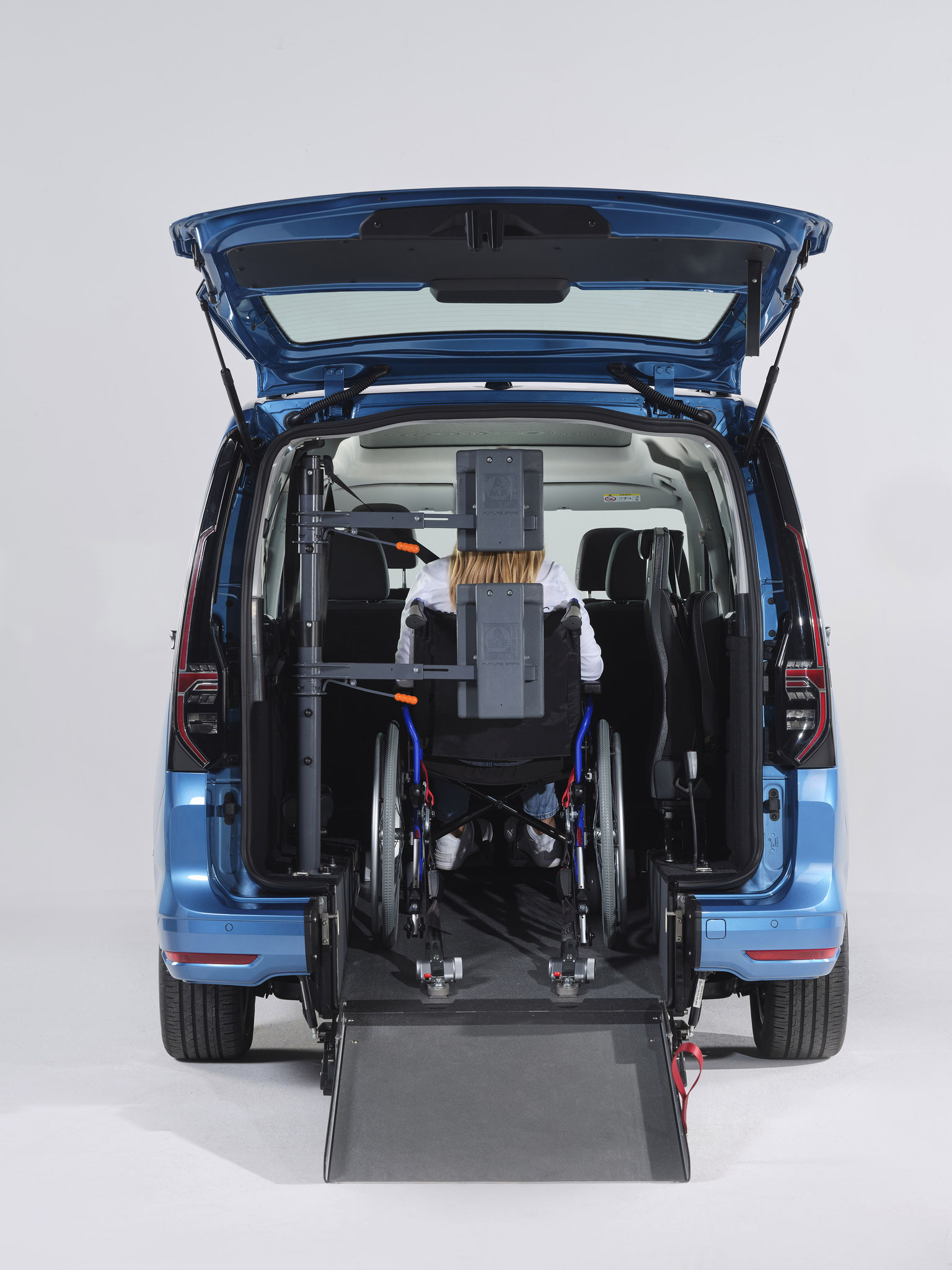 Der neue Volkswagen Caddy (5. Generation) ist ein rollstuhlgerechtes Fahrzeug für Passivfahrer. Durch den Heckausschnitt mit Auffahrrampe kann der Rollstuhlfahrer bequem befördert werden. Die rutschsichere Rampe mit EasyUse Funktion lässt sich mit einer Hand bedienen und ermöglicht einen einfachen Zugang zum Fahrzeug. Dank der tiefergelegten Bodenwanne entsteht viel Platz im Fahrgastraum. Mit Hilfe eines Personen- & Rollstuhlrückhaltesystems wird der Rollstuhl am Fahrzeugboden befestigt und die Person gesichert. Extra Schutz bietet die Kopf- & Rückenstütze FutureSafe.