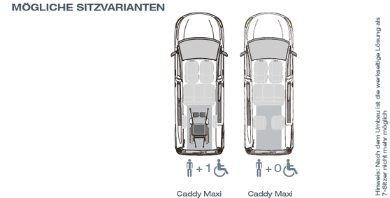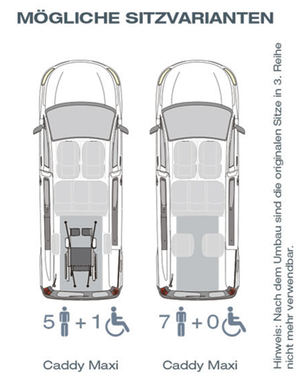 HINWEIS: Nach dem Umbau ist die werkseitige Lösung als 7-Sitzer nicht mehr möglich; Ab sofort ist auch der Volkswagen Caddy Maxi mit Hybridantrieb als rollstuhlgerechtes Fahrzeug für Passivfahrer umbaubar!
