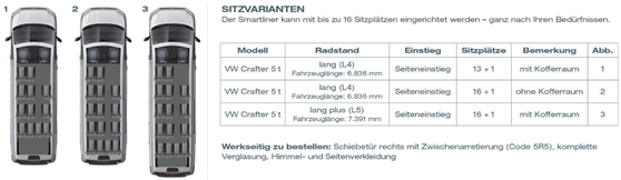 Für mehrere Fahrgäste und lange Fahrten ist der Warpel Smartliner auf Basis des Volkswagen Crafter optimal geeignet. Schon beim mühelosen Einstieg über die automatisch ausfahrbare Trittstufe und dem stabilen Haltegriff im Eingangsbereich beginnt ein Komfort, der selbst lange Fahrten angenehm macht. Hierzu tragen auch die ergonomischen M2 Einzelsitze bei, die dank der integrierten 3-Punkt Gurte für die nötige Sicherheit der Fahrgäste sorgen. Der Smartliner entspricht allen Richtlinien und Vorschriften für M2 Busse und verfügt über einen großzügigen Innenraum für bis zu 16 Fahrgäste plus Fahrer.