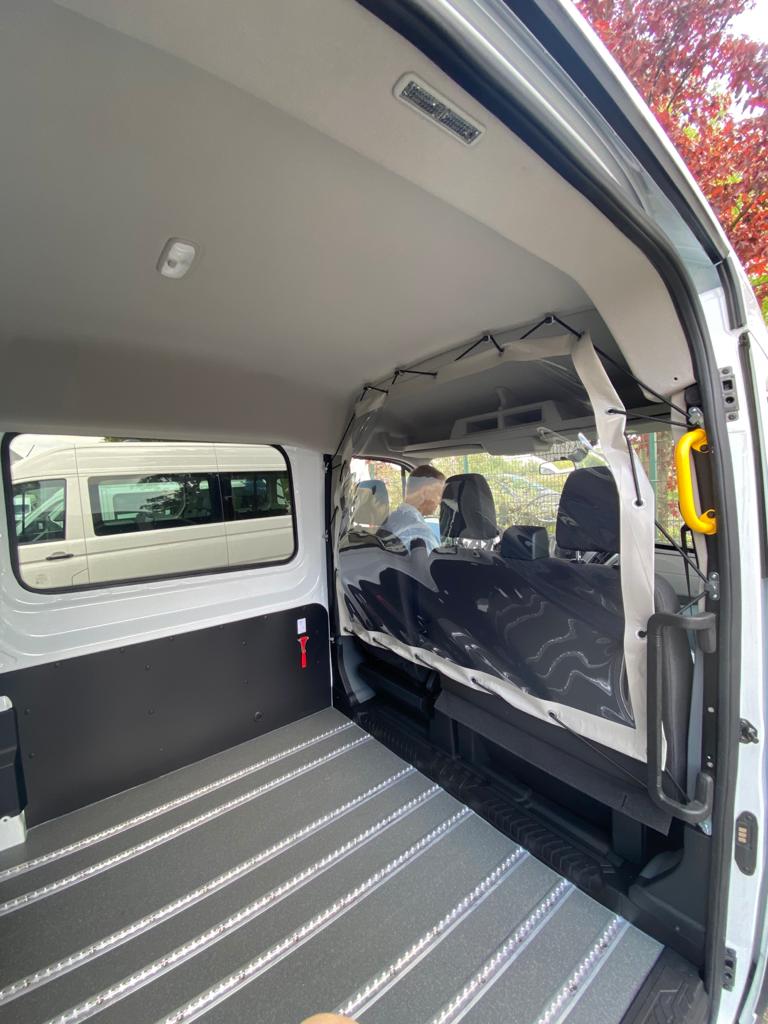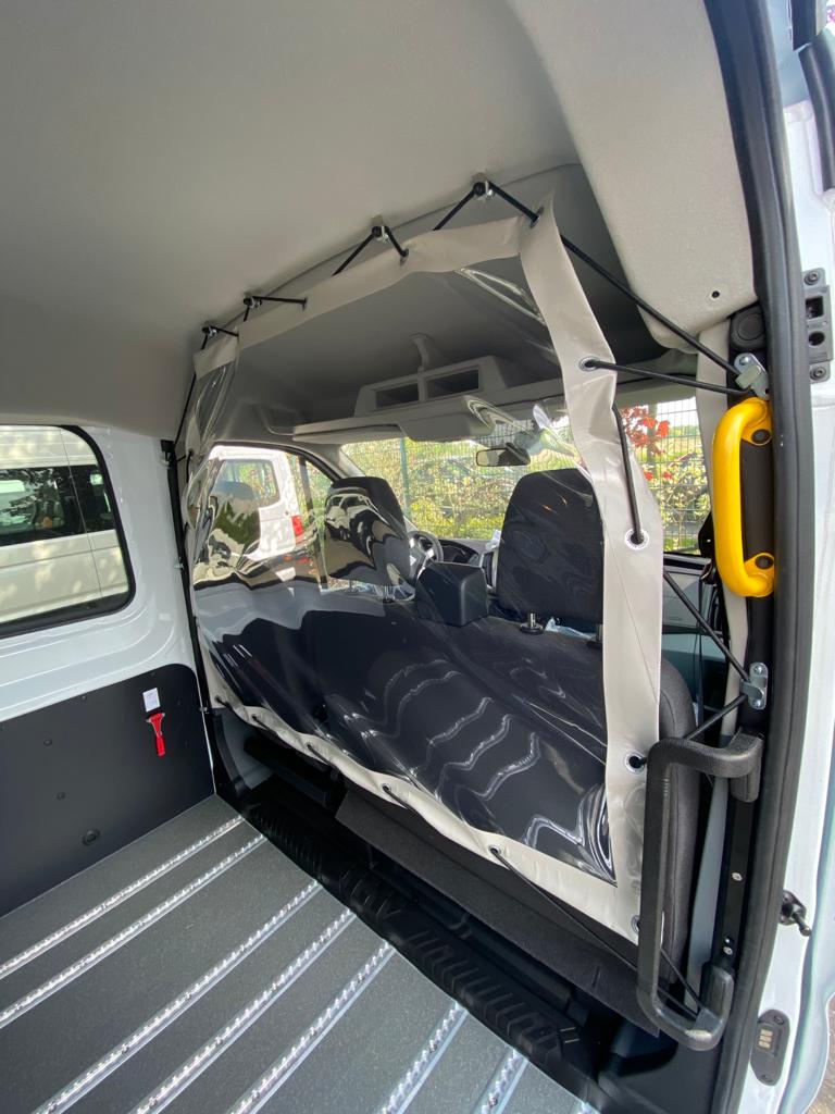 Die transparente Hygieneschutzwand separiert die Fahrerkabine vom