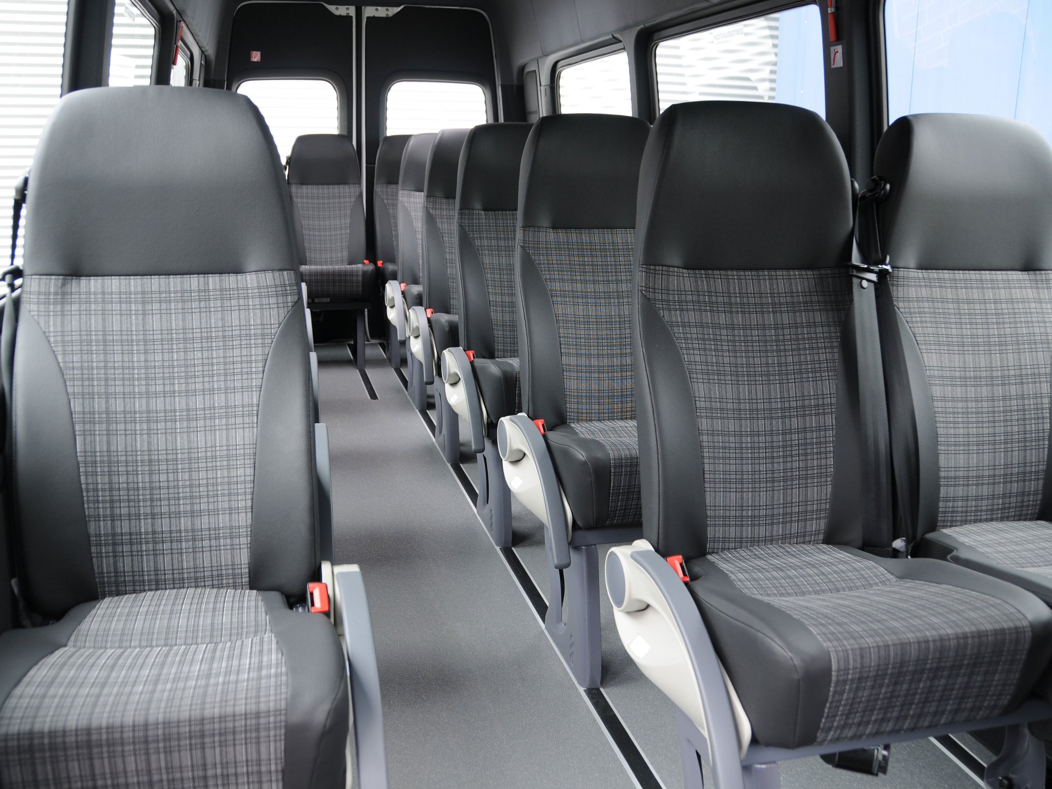 Für mehrere Fahrgäste und lange Fahrten ist der Warpel Smartliner auf Basis des Volkswagen Crafter optimal geeignet. Schon beim mühelosen Einstieg über die automatisch ausfahrbare Trittstufe und dem stabilen Haltegriff im Eingangsbereich beginnt ein Komfort, der selbst lange Fahrten angenehm macht. Hierzu tragen auch die ergonomischen M2 Einzelsitze bei, die dank der integrierten 3-Punkt Gurte für die nötige Sicherheit der Fahrgäste sorgen. Der Smartliner entspricht allen Richtlinien und Vorschriften für M2 Busse und verfügt über einen großzügigen Innenraum für bis zu 16 Fahrgäste plus Fahrer.