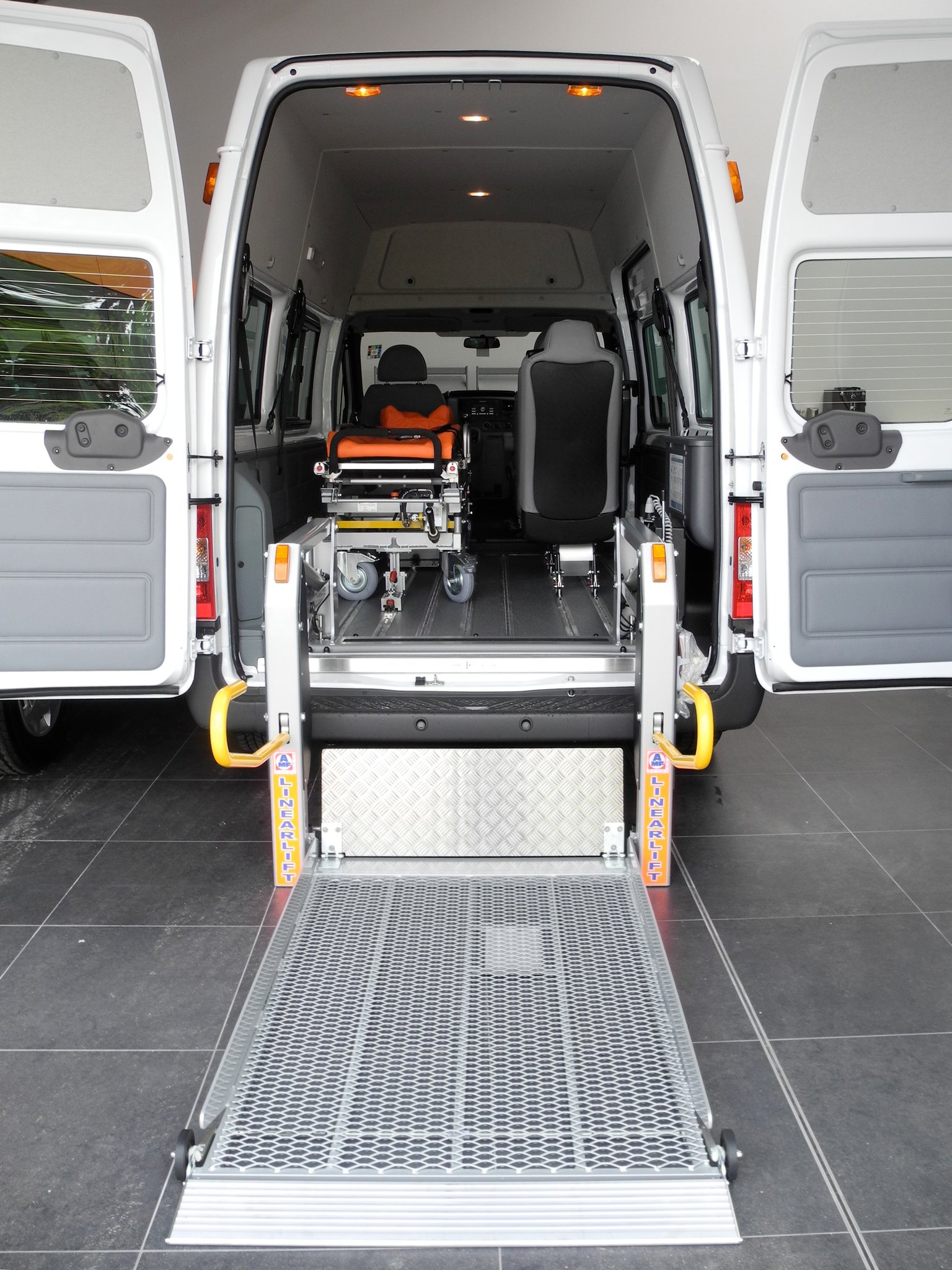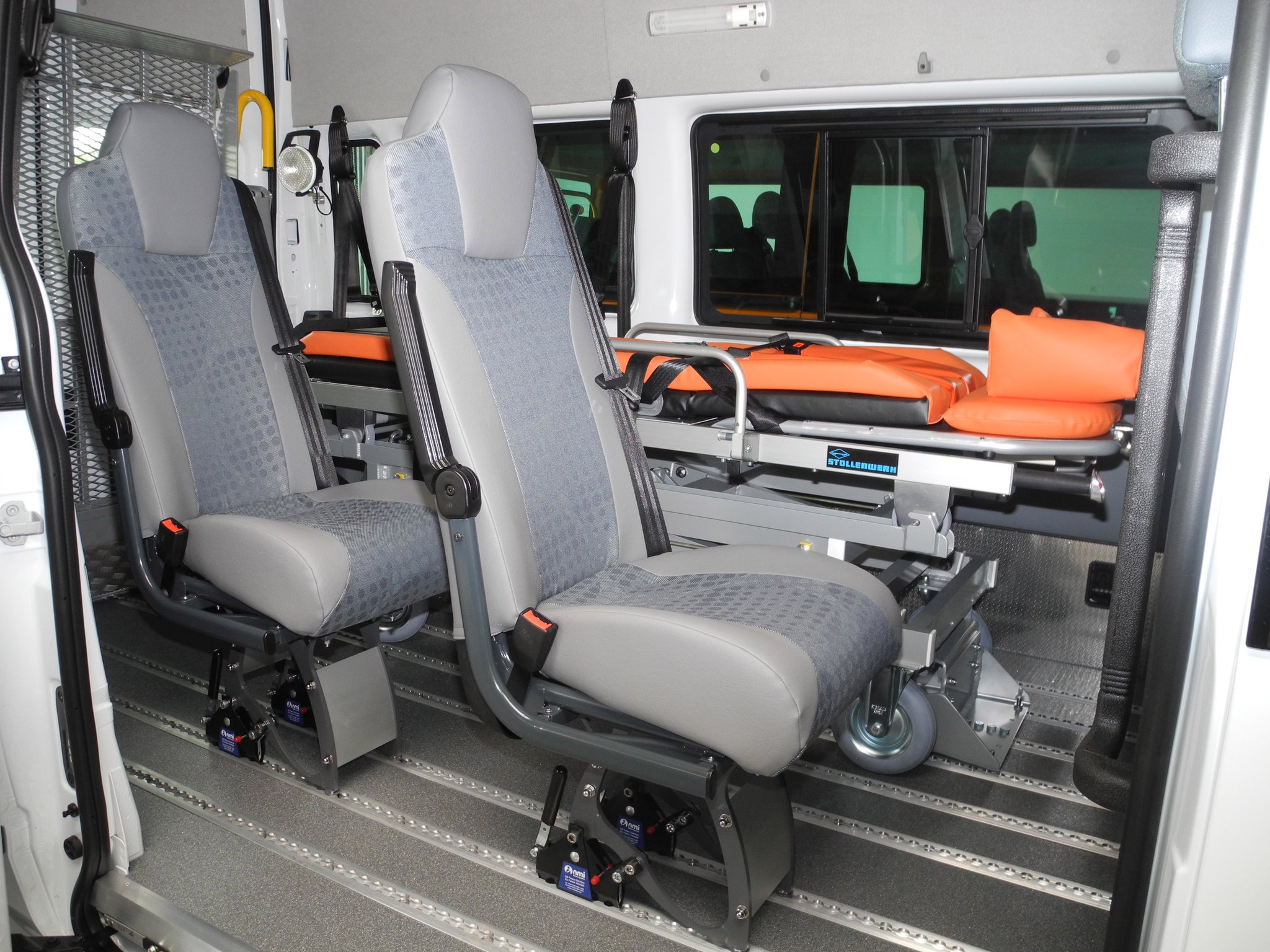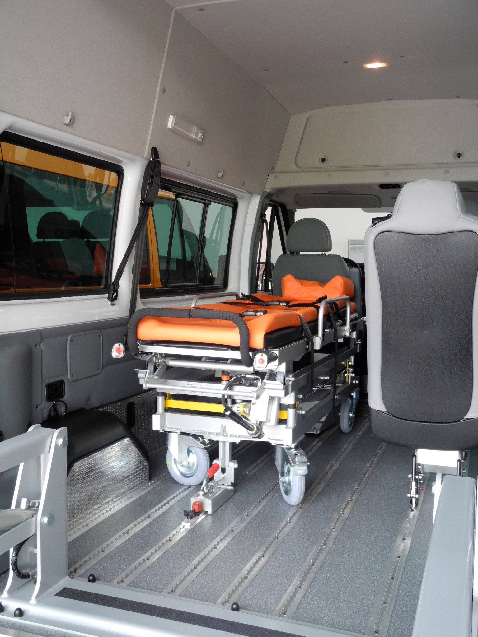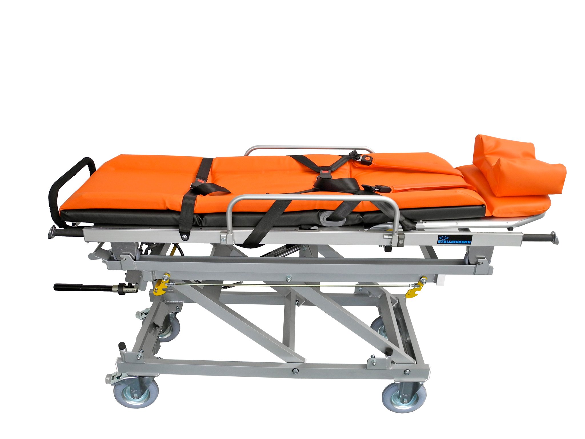 Die hydraulische Fahrtrage ist die ideale Lösung für die kombinierte Beförderung von Rollstühlen und Krankentransport. Die stufenlose
