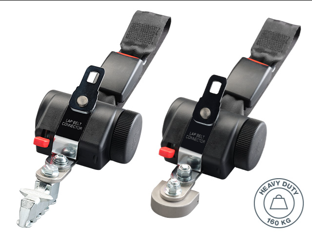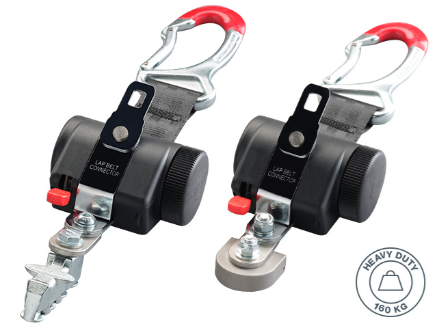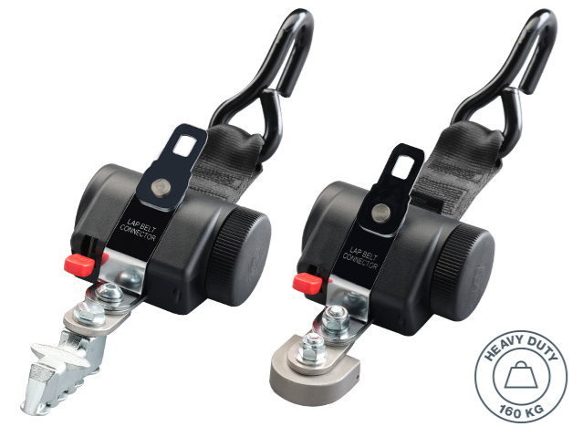 Dieses besonders stabile 4-Punkt Sicherheitssystem überzeugt durch das resistente Design und die besonders einfache Handhabung. Die Retraktoren werden mit einem Mono- oder Vierfachfitting am Fahrzeugboden befestigt. Mit Karabiner, Haken oder Schlaufe lässt sich der Retraktor ganz einfach am Rollstuhl befestigen.